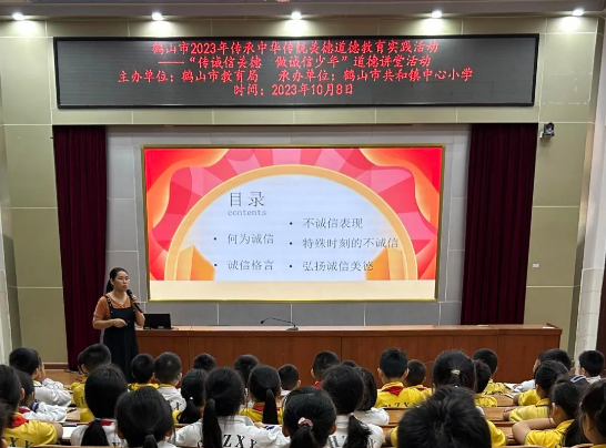 诚实守信是中华民族的优良传统,是做人之本,立德之源。为大力培育和践行社会主义核心价值观,进一步弘扬诚信文化,提高学生诚信意识和个人品德建设,积极营造诚实守信的良好校园氛围。2023年10月8日,鹤山市共和镇中心小学组织开展了“传诚信美德,做诚信少年”的道德讲堂。