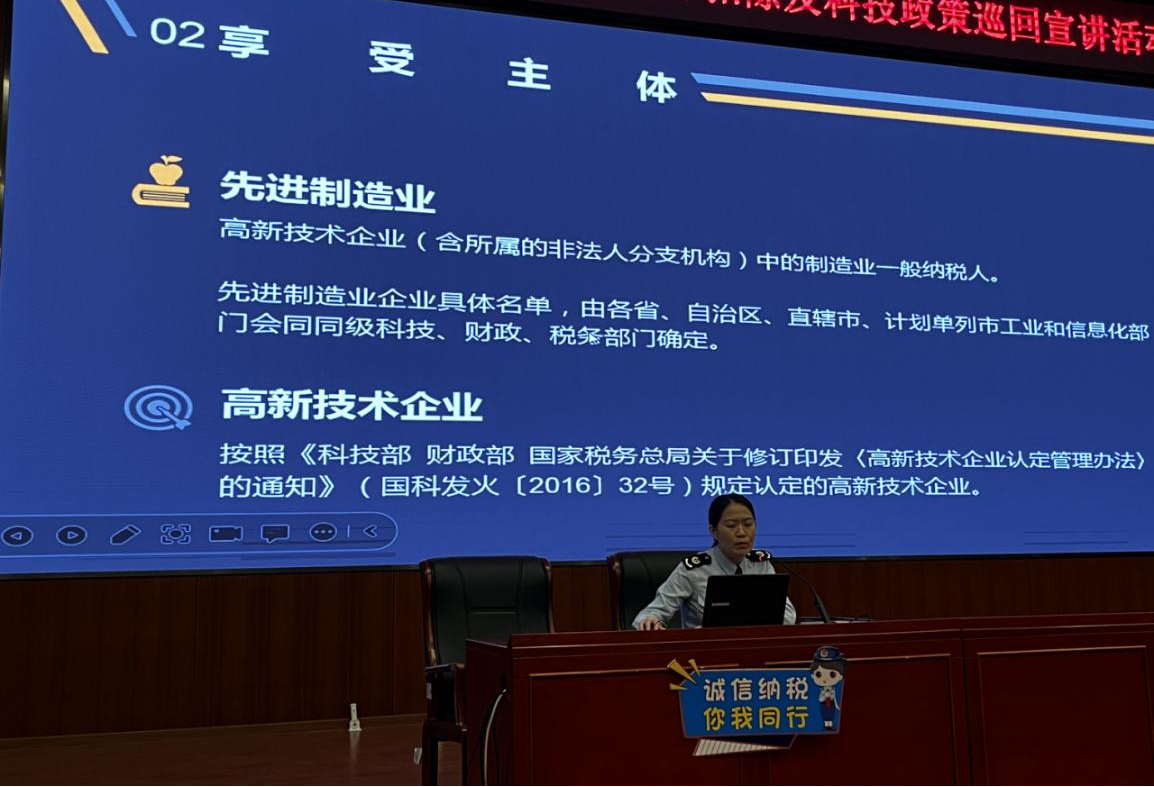 会上,重点解读了先进制造业增值税加计抵减政策、研发费用加计扣除政策以及高企、科技金融、科技创新平台、重点实验室、技术合同登记等科技政策。通过联合宣讲提升企业对科技优惠政策的熟悉度,促进企业加大研发经费投入的积极性和主动性,切实把政策利好转化为推动企业创新发展的实际成效,提升纳税人税法遵从度,提倡依法诚信纳税,推动地方经济高质量发展。