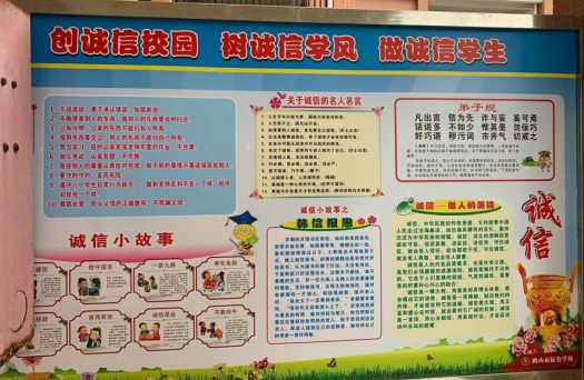 深入贯彻习近平总书记关于加强诚信建设的重要指示精神,引导学生树立和践行社会主义核心价值观,自觉成为“言行合一、践诺笃行”的先锋力量,进一步推进社会诚信建设,提高社会信用水平。鹤山市中小学结合学校各项工作开展的实际情况,利用宣传橱窗和板板积极营造宣传氛围。
